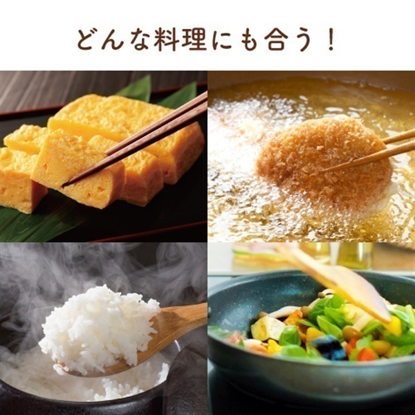 揚げ物をはじめ、炒め物・焼き物、和え物やドレッシングなどの生食、炊飯時にひと足しなど、調理方法を選ばずあらゆる料理が美味しくなります。毎日のお食事にぜひお役立てください。